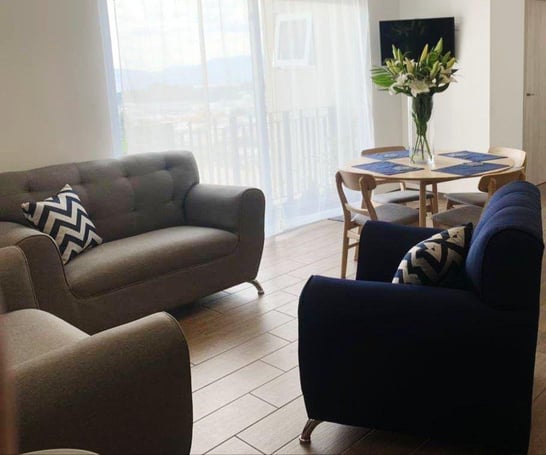 "Estoy satisfecha con mi nuevo sala: la calidad es excelente, es cómodo y mejora la apariencia de mi casa".